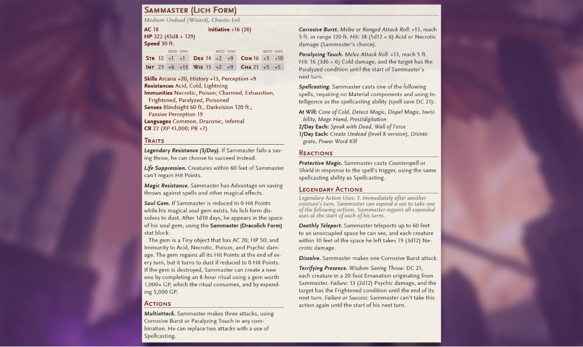 Sammaster is a CR 22 mastermind whose is notoriously difficult to defeat, even for adventurers at the height of their power. His Magic Resistance and Legendary Resistance traits and Protective Magic Reaction make it easy for him to shrug off even the most powerful spells. Meanwhile, he is difficult to pin down because of his ability to cast Invisibility, Wall of Force, and his Deathly Teleport Legendary Action.