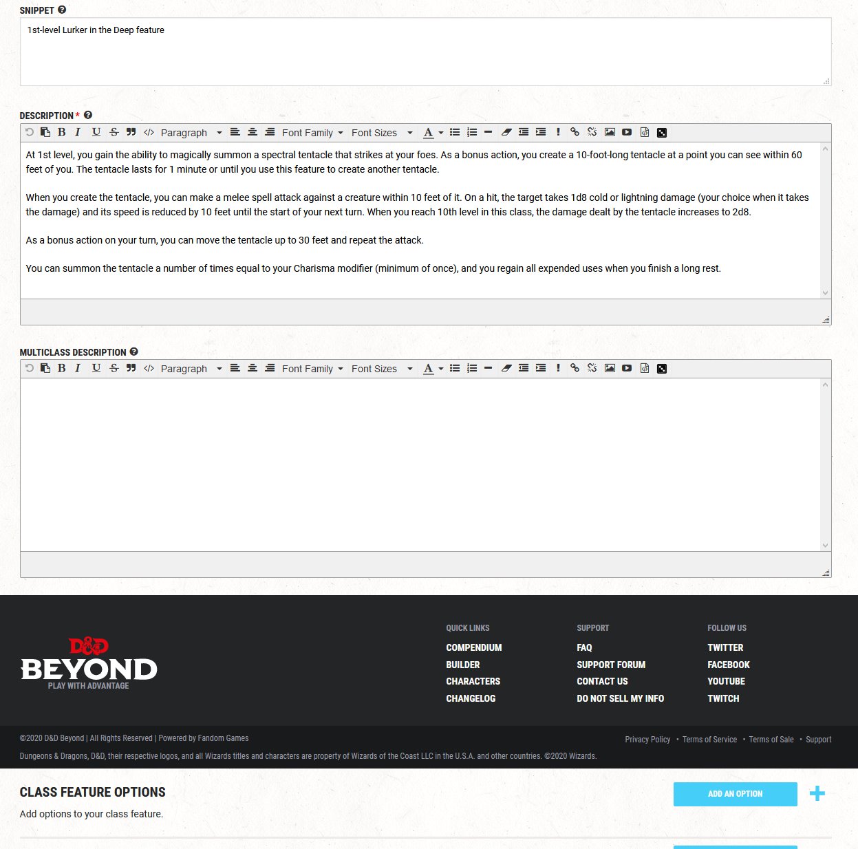 hi guys! something weird: when creating a homebrew subclass and adding extra features, the bottom dndbeyond info banner pops up in the middle of the page blocking the lower options including saving changes. welp!