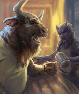 scene something very roughly to this...simple table, simple fire in the background (although what's shown isn't a fire), both holding their mugs or drinking from them: https://1.bp.blogspot.com/-V_HFvGHmQCc/XuFR9WdNLoI/AAAAAAAAB4A/fG25B6mLDwkFE8pssFI--5W7WMBKLAziwCLcBGAsYHQ/s320/Minataur+in+bar-credit+Adela+Quiles.png