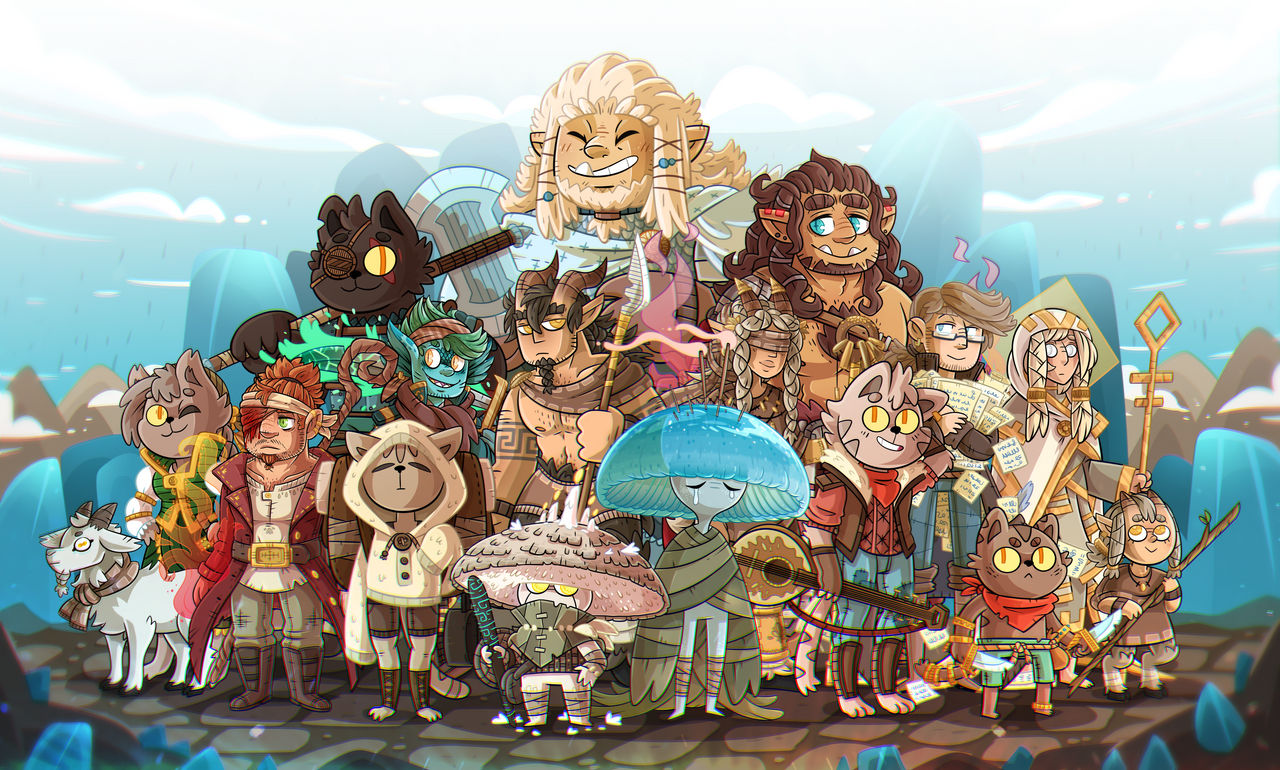 There's Jonas the orc-elf war mage, Atlas the orc monk/cleric of war, Prospero the human bard, Kas the satyr monk, Belzes the triton warlock, Arcane the human cleric, Mycen the myconid death cleric, Achille the dwarf illusion wizard, and Portobello the myconid druid of spores...
