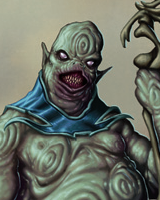 The scout team goes slow, cognizant of the dust the rises so easily. It also dawns on Keller that with the tower having rumbled to quiescence, there is little to no wind here, the dust disturbed just rises up before settling back down. The three of you creep closer and peer carefully over a ridge down towards the tower ruins as the plume arrives. There are assorted creatures, mostly small and bipedal, but adorned with spikes that seem to protrude from the skin. There are a pair of talk, hulking figures, bones and viscera visible through translucent flesh that is either purple-pink in color, or illuminated that way by the lighting in this place. There is one many limbed creature with vicious hooked blades on its arms, very similar to the creature that slashed Storm back in the tower. They all seem to be moving under the direction of a portly figure being carried on a poled platform transported by the efforts of creatures that look to be assembled of left over parts, a tangle of legs of all sorts, with arms and tentacles above grasping the poles. The platform is lowered, and the large figure stands, leaning on a staff. They are lightly clothed, and their grey, waxy skin has what almost look to be symbols carved or pressed into it. They hiss at their underlings from a gaping toothed mouth below noseless features, and a handful of the skittering spiked ones head into the ruins.