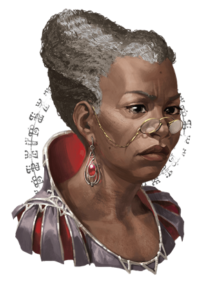 The bookish woman replies, without even looking up, "A bit of quiet would be preferable, Mr. Yogilby. My studies are of the utmost importance to the safety of the realms which of course you wouldn't understand, since it has nothing to do with either music or drink."
