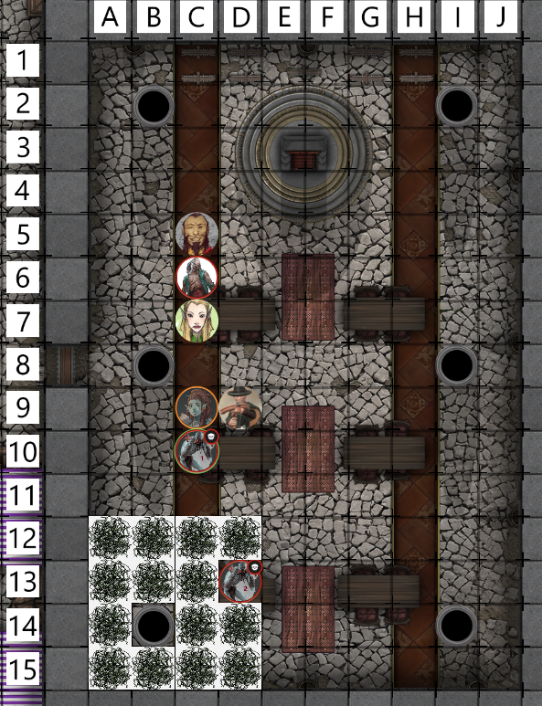 Both of Aurelius' attacks hit the Zombie. (Without Advantage, as Elyria said she was hiding.) The Zombie is starting to look wounded.