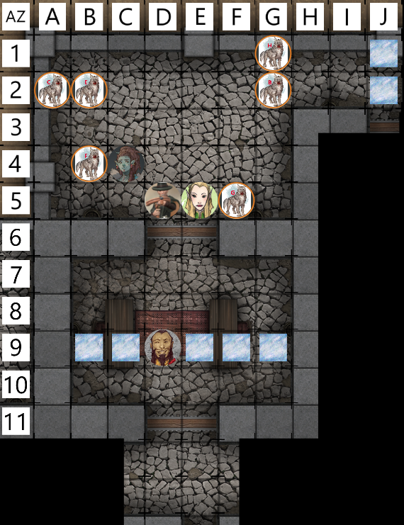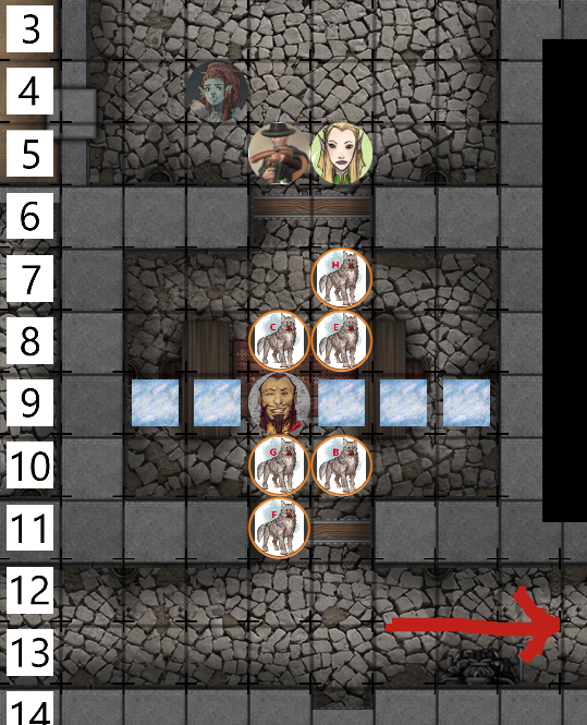 Only Wolf B and Wolf F remain standing. (Can move 4 spaces, or 8 spaces if Dash.) Wolf C, Wolf E, Wolf G, and Wolf H are prone. (Can move 2 spaces, or 6 spaces if Dash.)