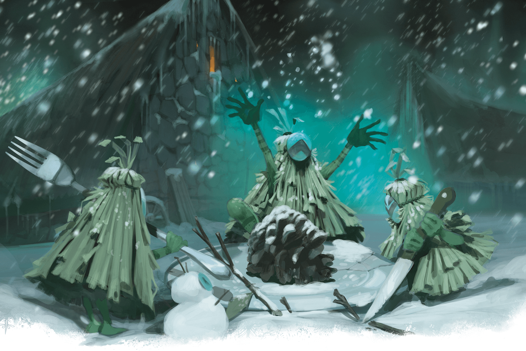 The group decides to head into the forests. The footing in the woods is too treacherous for the axebeaks so you dismount and leave them on the road tied up. They stand their obedient, but glaring at you..plotting your demise and their world domination if only their small brains would allow them to figure out how. You follow the fox path into the forest for about five minutes before you see some activity in amongst a cluster of conifers ahead. Sneaking forward, you see a dinner plate with branches and pinecones arrayed on it is placed between three small spirit creatures dressed to look a lot like a tiny pine tree, but with a mask over where a face would be and tiny spindly arms sticking out of the outer green jacket. One chwinga is sitting at the edge of the plate while the two others are moving a fork and a knife...ineffectively along the twigs and pinecone. They don't seem to have noticed you and are busy....it would appear....playing at eating a meal.