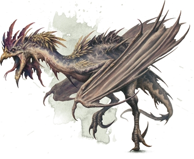 The party reaches the easternmost room at the end of the hall and opens the door without incident. Entering the room cautiously, you find that smells of alcohol and brine permeate this room. Glass vessels large and small stand in rows on the floor and tables, ranging from one foot to six feet tall. Inside each vessel is the body of a creature floating in clear liquid. One four-foot-tall container at the far end of the room is missing its lid and has no occupant. While it is difficult to make out the specific creatures in each vessel from your current vantage point by the door, you can see that one near to you contains what looks like a hideous hybrid of lizard, bird, and bat, roughly one metre in length.