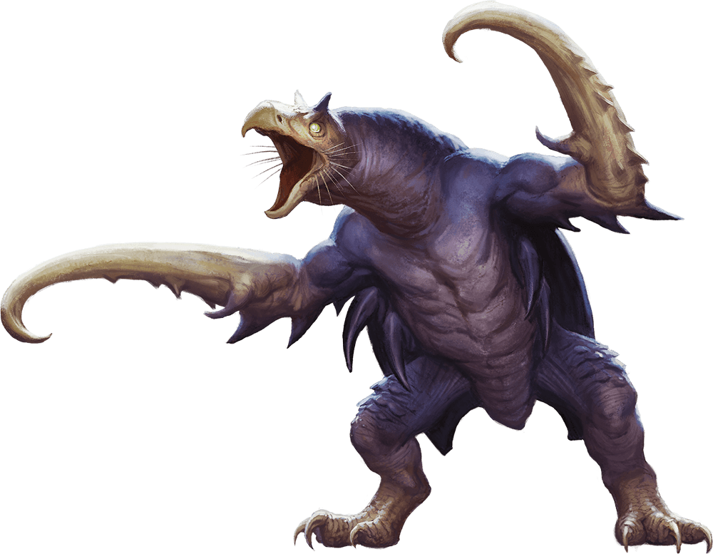 This 35'x40' room is empty except for a circle of vile symbols on the floor. Standing in the circle is an eight-foot-tall, bipedal creature with two long arms, each one ending in a sharp hook. The creature has its back towards you and wears the tattered remnants of a butler’s uniform.