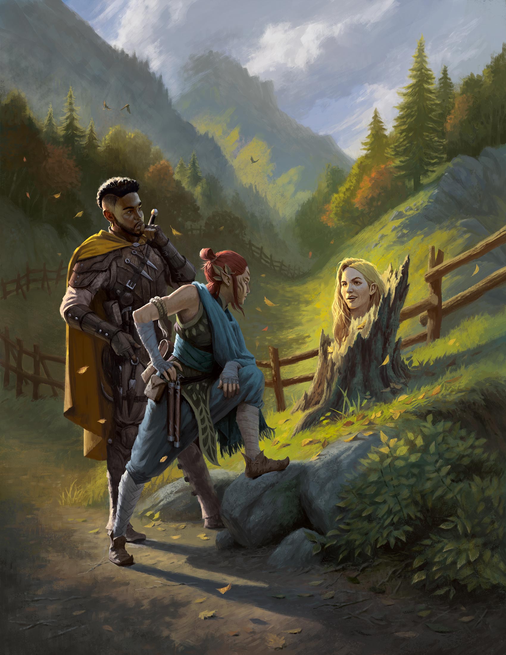 Your trip from Daggerford yesterday towards the Delphi Mansion was an easy trek through grasslands and rolling hills, the distant peaks of mountains visible in the distance. The campsite was well chosen by Meiki, and together you all find plenty of fruit, wild berries, and even some tubers for a supplement to your rations.