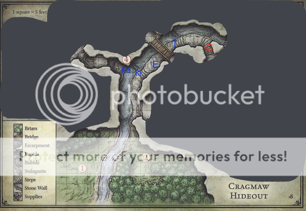 Titus, Kryinor, and Eedim move carefully further up the tunnel to the north. Titus follows it as it curves around to the east, and moves under and past he rough wooden bridge spanning the stream twenty feet above. He moves up tot he apex of the curve ans sees the path slope upwards gently with a few steps carved here and there. He then notices a goblin leaning against the cavern walls twenty feet away half way up another set of stairs. It does not notice him as he observes. The stream itself runs past the steps and the goblin and finishes in a rough stone wall with a small drain hole in it that the water sprays out of.