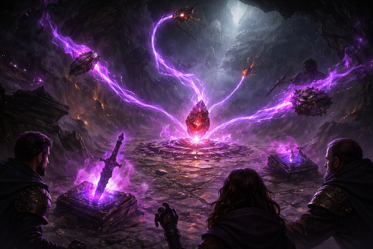 Then, every item containing a shard of Sserah's soul begins to glow with a sickly purple light. You can hear hisses and whispers in some ancient language as the shards of Sserah's soul are pulled towards their new vessel. Three shards... and then... a fourth. Pulled from outside of the cavern. From the dark wizard himself. You can feel the shards pulling away, resisting the call, but even the Mad Dragon Lord cannot overcome this power.