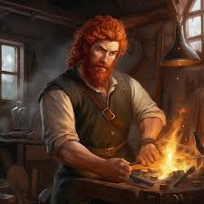 This smithy is little more than a one-level log cabin with an overhanging thatched roof covering a workbench, stone forge, anvil, and grinding wheel. Various tools hang along the walls beside several finished weapons. The elder Crowe is a quiet family man who stands six feet tall with fiery red hair and beard. He’s drenched in sweat and soot, and is currently wearing a greasy pair of old goggles.