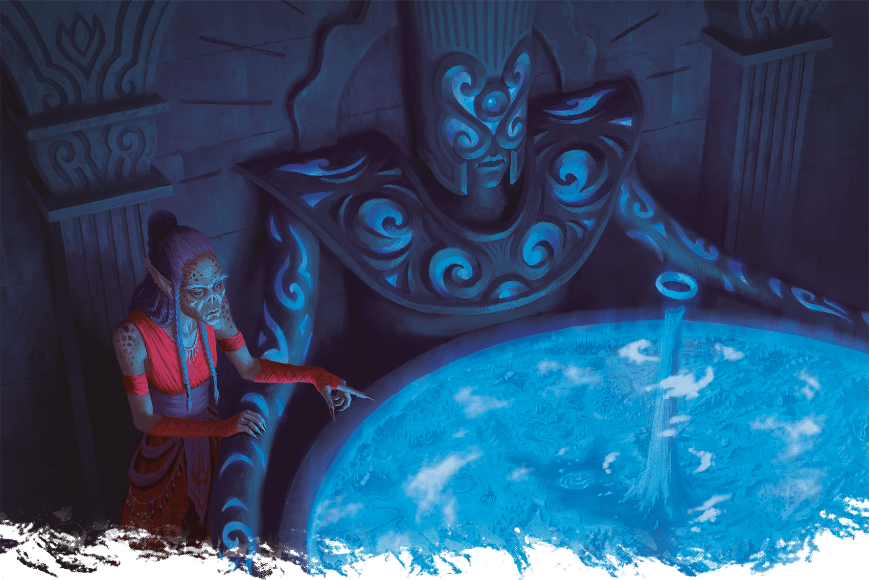 Zaythir interrupts with a small wave of her hand. "Fortunately for you then, this tower can take us around the Outlands. Let me show you." She then descends to the level below, to the round table the fiendish bugs were at a while ago now. When she arrives, she utters a word and the body begins to animate, before an illusory version of the Outlands is projected on it. "This is the Castellan. They can direct the ledcaru anywhere you wish to go here in the Outlands. The ledcaru only has one speed when it walks. The Castellan can understand your common tongue, and as long as we remain on favorable terms, it will take you where you wish to go."