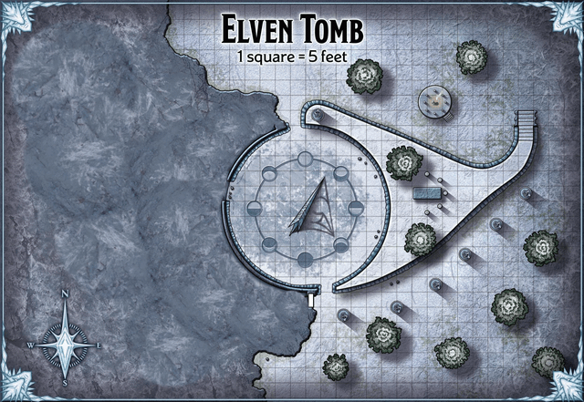 The tracks lead to a large, circular indentation in a snowy hillside. Rising from the middle of this circle is a triangular gnomon of beautifully carved crystal that stands twenty feet tall. A ten-foot-high berm hugging the circle’s eastern edge has evergreens growing around and atop it, sheltering what looks like a sarcophagus buried under snow and enclosed by a half-circle of pale blue crystal pillars. North of the berm is a delicately carved gazebo made of marble, and south of the berm is a row of outward-facing, white marble statues atop granite pillars.