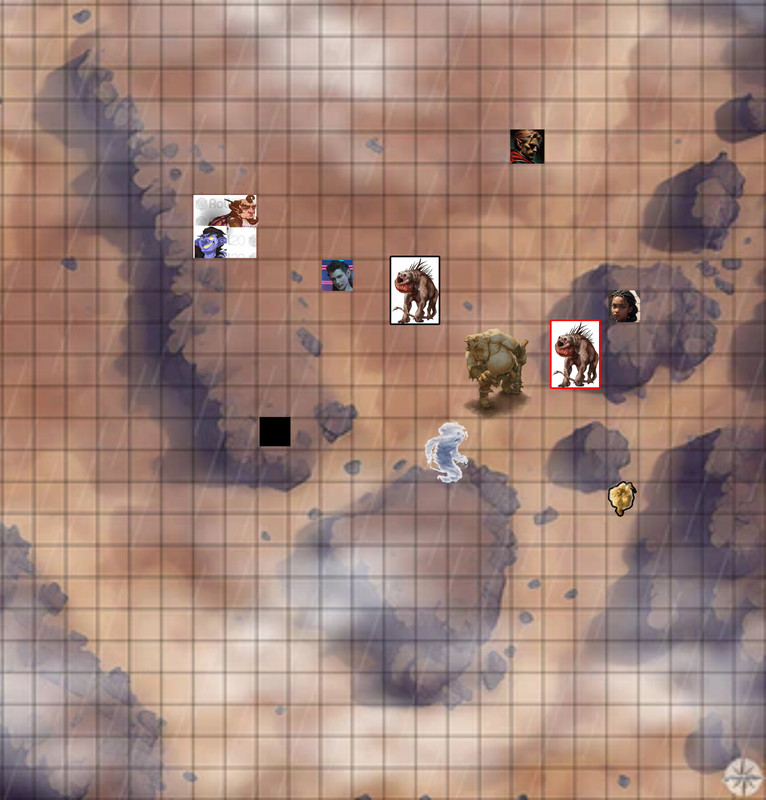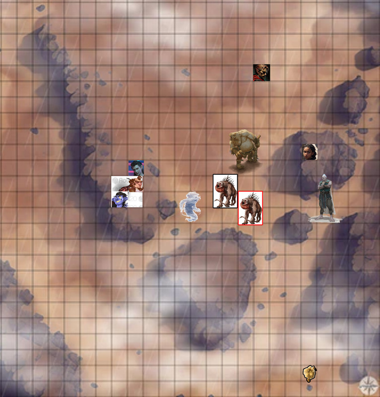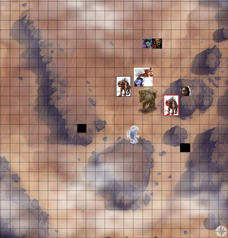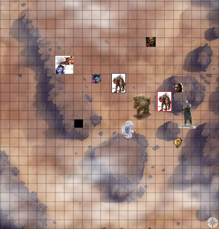 “Barkly, somethin’ seems to trying to arrive over there too” Merkas points over at the other thing forming south of them. “Why don’t we surprise it?” Barkly moves over to the forming wind/dust creature and waits for something solid to attack. (Held attack: To hit: 11, Piercing Damage: 6)