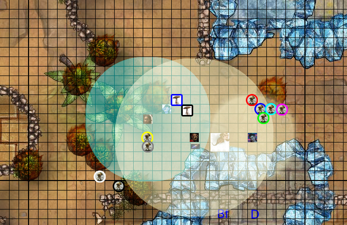 He turns and moves over to where the young ones are approaching Orr and faves his fingers around “Blinky, make these guys blind!” Blinky appears a split second before erupting in a cascade of flashing and swirling lights in the direction of the little mushroom people. (30’ movement to the square one up and to the right of Orr, Casting Dancing Lights: Con Save DC16 or be blinded. 15’ cone aimed to get as many of the little ones as possible)
