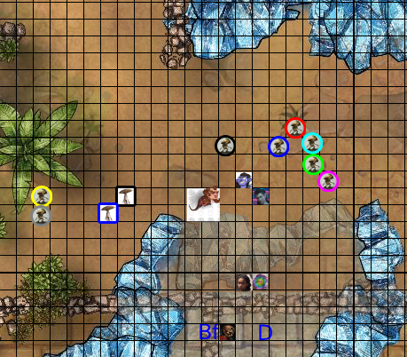 Merkas moves over between Barkly and the adults. (4 squares left and one square down) “Sorry, I guess it’s best we don’t yell at each other. Barkly won’t hurt anyone, she prefers more sinew in her meals, and heat, haha. I hope you understand me, I don’t have any knowledge of your language but other than symbols like Orr’s how can I prove we don’t want to harm you?”