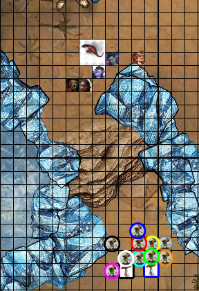 With Hastos's legs fluttering underneath, he has a hard time staying behing Sera, but he manages to slow himself enough to keep pace. Merkas and Buckeran, on the other hand start straggling behind. Barding is a bit easier to take off than it is to put on, so it'll have to wait. You pass by the first crystal outcropping, and noticed more bones of deceased adventurers. It would appear not everyone escapes a kobold patrol unscathed. Then, you round a bend and find a natural staircase that leads down into the myconid home, and acts as the territorial demarkation for the two communities. The myconid community is much larger than what you saw before. There's about 20 in all, and at least half of them are sprouts. Though they are soundless, their expressions seem quite forlorn. Their heads are wobbling and if you had to guess, they're trying to figure out how to restore their precious mushroom grove. Two adult Myconids are doing their best to console the cluster of Sprouts waiting in safety away from the grove. Their attention seems to be on each other, and they haven't noticed you yet.