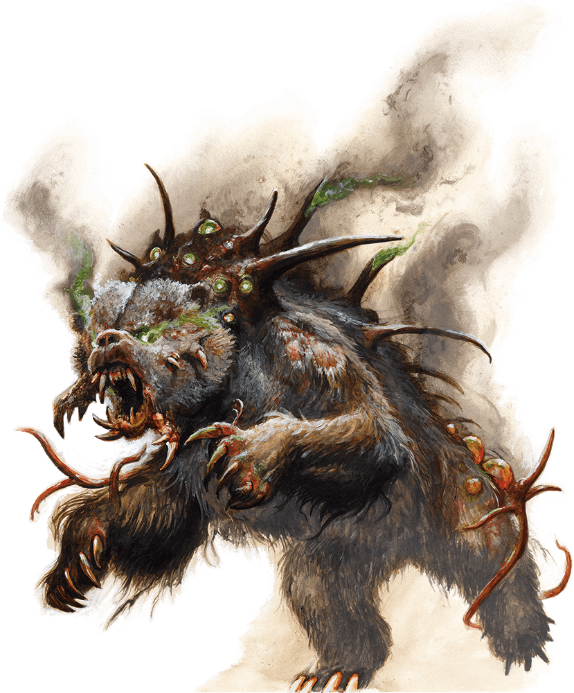Round 2: Zyllynne howls back at the mutated bear and brings the smackdown! (ouch!!) Vesta begins casting another spell, only to have the beast swipe at her again in an attempt to disrupt the spell (Attack: 14 Damage: Unable to parse dice roll. . On a hit, make a DC 15 Intelligence saving throw or the spell fails and has no effect. if you pass, the blazebear has advantage on saving throws against spells and other magical effects, so it's save is a straight roll. DC20 Dex (if needed) 8) Davis(can he find his way back through the mist? Make a 1d4 roll as part of your action if you move!) Vanizisteps in and engages the melee, a green-flamed greatsword adding to the damage caused by Zyl's greataxe! Beast(-155 at this point!! =O
