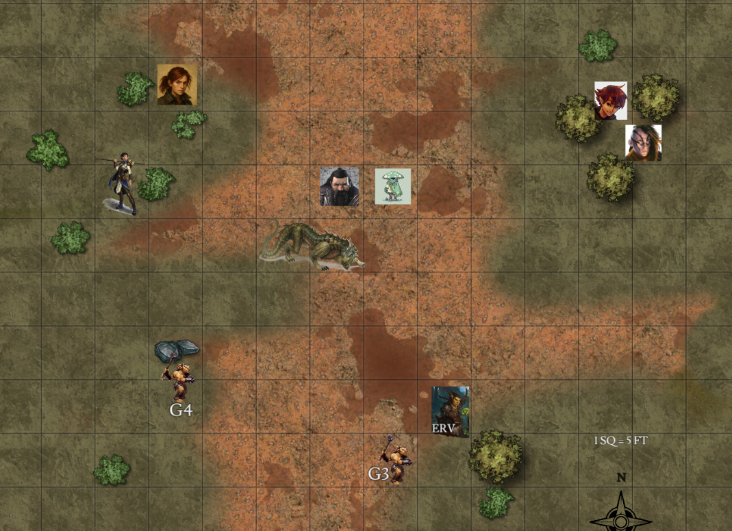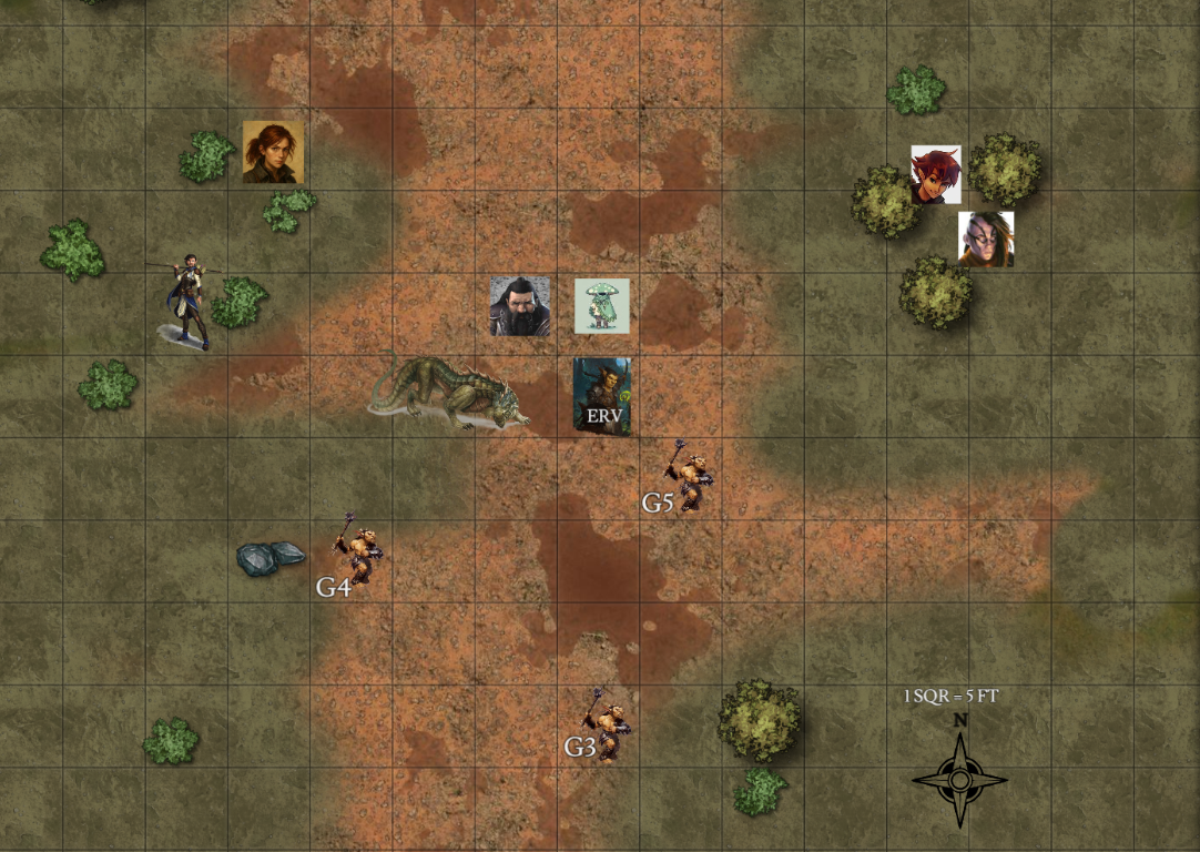 All three attacks find their mark. Both goblin 4 and Erv are looking bloody and battered, struggling to stay upright. Leosin throws another dart, this time at the ambush drake. The weapon whistles through the air and buries itself deep in the beast's side. (17 to hit, 7 dmg) The ambush drake roars, infuriated.