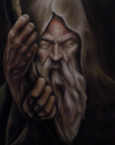 There are two people sit on the wooden benchs that aling at the walls of the temple. A young woman dressed in dark clothes and a old man, withered and with a few long hairs dropping from his head and a white beard. He leans over a wooden staff and says.