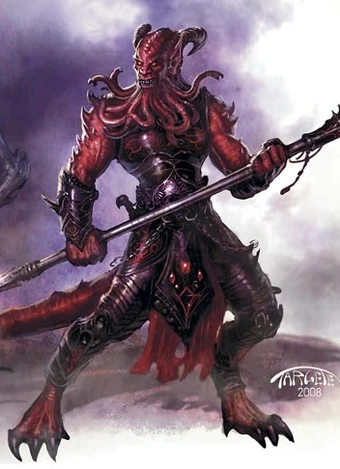 Stealth might not be that necessary - robes and masks were still covering those ahead of the group and fresh blood was not that visible on black (and probably not that important to begin with). When those disguised of you turned right (Reya guarded the rear - she did not like the open space behind), you saw that corridor goes further north barely 25ft ending in yet another intersection. And in the middle of it stands a broad-shouldered figure with purple skin and a beard of writhing snakelike tentacles, tightening its grip on a glaive as it glares at you quite suspiciously. A ring of keys hangs from the creature’s belt, jingling with every impatient move creature makes. After several seconds of glaring creature growled something with the question in it, and Fran recognized Infernal: "What is happening?"