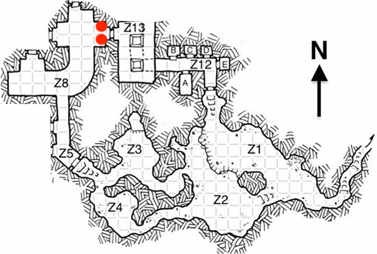 Scoria's innate ability erases all traces of the adventurers passage into the room as each hero presses into the shadows of the walls. With a sudden smash, the door Scoria had latched shut bursts inward, and a pack of ghouls rushes into the room. Surging toward the dancing dagger in front of them, they fail to notice the slippery floor and careen headlong into the far wall, a jumble of grey, skinny arms and legs.