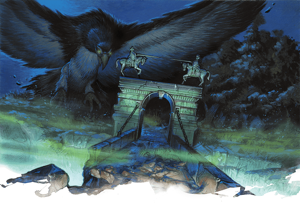 And so, the MistBusters (and Kasimir) set off once more. Avoiding the traps of the temple, the whispering voices, and giant janitors, you rest for the night in Kasimir’s cove. You once again trudge through the blisteringly cold snow, and work your way back along the Tsolenka Pass. The remains of the demons still stain the way back through the curtain of green flame, which rises once more as you cross over it. The black rider is nowhere to be seen, yet the heavy fog of morning clouds your view. However, on the air, you hear the heavy beat of... battle drums? No.. no... that’s not it. It sounds like... wings? That’s when a impossibly massive form clears the fog. Diving toward the bridge is a creature of unearthly size — a bird so monstrous that its wings blot out the sky. A deafening shriek pierces the silence as a giant taloned claw grabs onto a horse and is now pulling you toward the bridge.