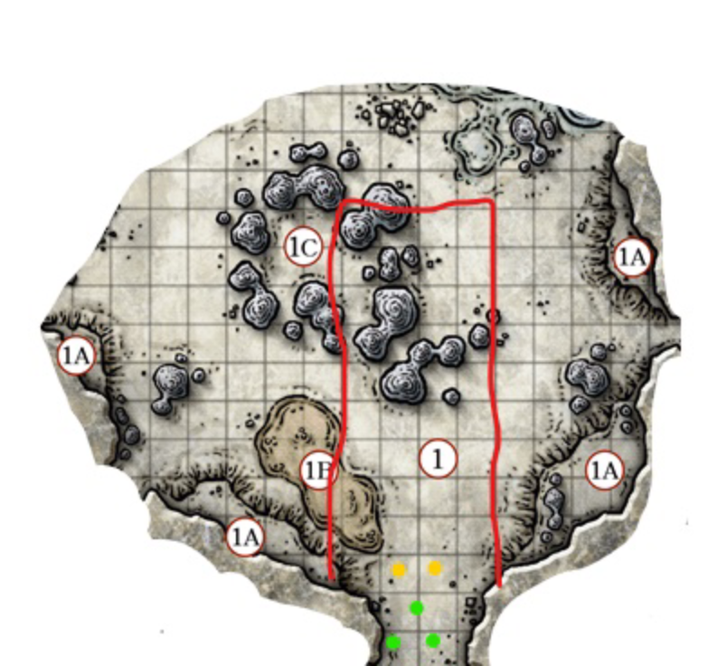 (Los goblins están en las zonas altas 1a, que se levantan a 10 pies de altura (3 metros aprox.), y el ogro está en la zona 1b. Todos los personajes excepto Dylan pueden ver el mapa entero. Dylan solo puede ver lo que hay en el recuadro rojo. Los puntos amarillos son Dylan y Krommir, mientras que los verdes son Aramil, Gash y Lariens. Los NPCs están aún más atrás.)