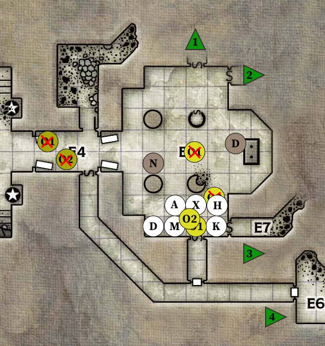 Not wanting to deal with any kind of return gesture or such, Kaemgen quickly climbs back to his feet as he surveys the room. He spots the two yellow blobs still causing trouble but his eyes most firmly fall upon his fallen swords. Rising up and quickly scampering after them, Kaemgen spends his full movement to Dash back to the entrance of the secret door where he fell and reclaim his weapons. ((Half movement to regain his feet, then movement to door mostly eats up his movement. Pick weapons back up and then turn around to face the foul nose nuggets!))