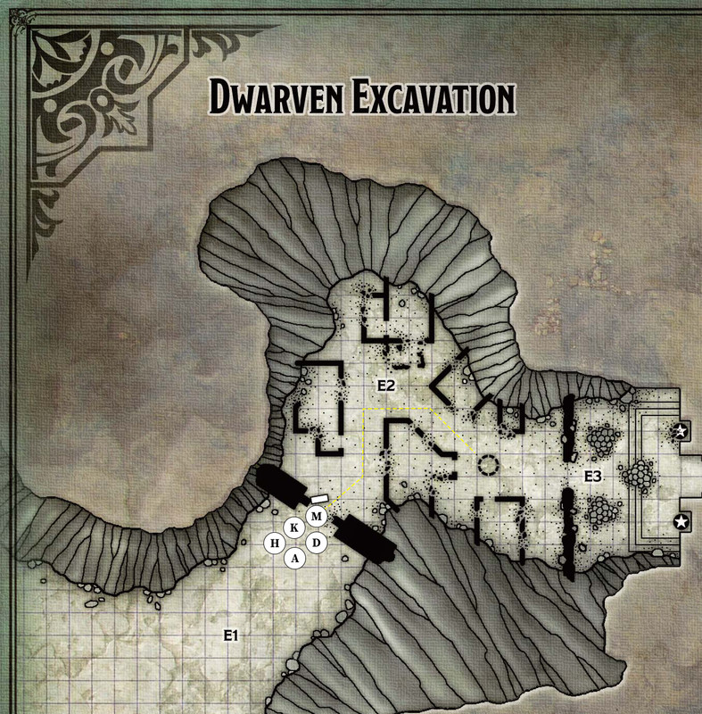 (E3) A partially collapsed, ten-foot-high wall separates this courtyard from the settlement west of it. Three heaps of rubble are piled high in this area. Hewn from the canyon’s back wall, a thirty-foot-high temple facade features steps rising to a stone platform. Cut into this facade is a ten-foot-high open doorway flanked by crumbling, life-sized granite statues of cloaked dwarves. Evil grins can be seen on their weatherworn faces.