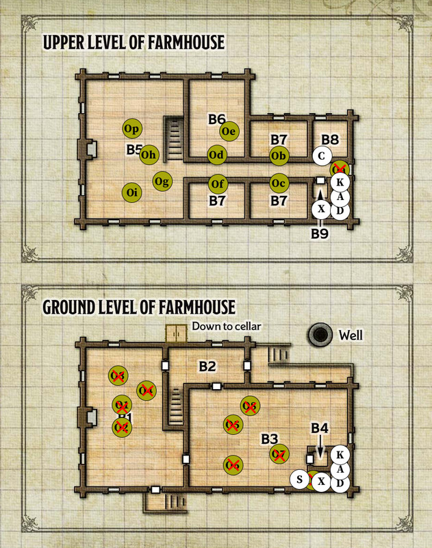 Oi sees it getting crowded in the hallway. It'd take a moment for the wheels to turn, but eventually the orc would decide to take a different route. Grabbing his axe, he heads down the stairs to the porch(B2) to make his way to the dining room(B3).