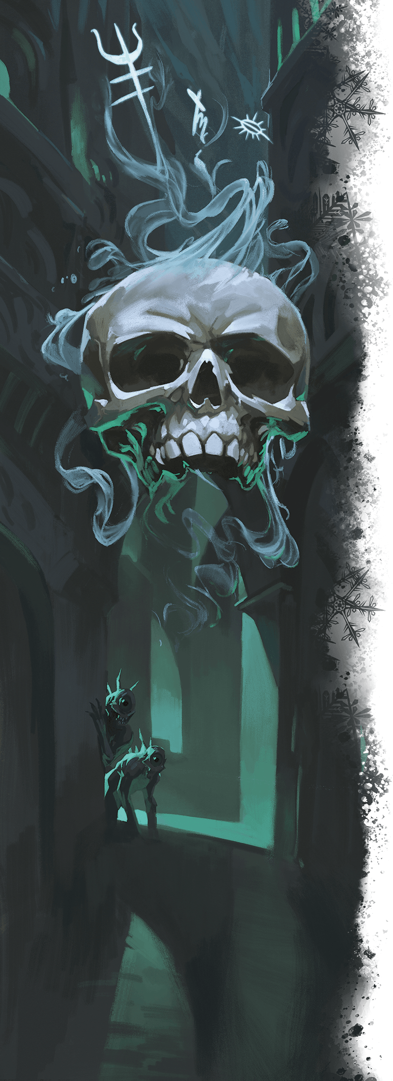 Perched on the edge of the pit are three aberrant creatures, each one staring at you with a singular, hideous eye. Floating above the middle of the pit is a human skull with wispy, arcane symbols forming above it.