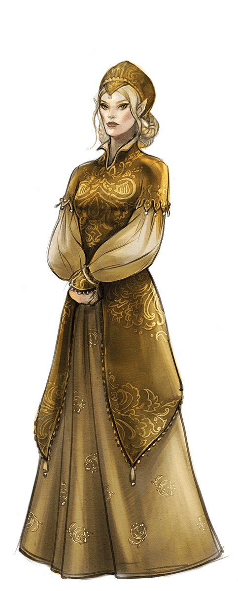 A female sun elf sits on one of the balconies, wearing an opulent gold dress. She holds herself as someone who puts on a powerful facade, a regal aura emanating from her. At this one moment however, when she’s seemingly alone, you see her mask slip just a little, as she stares into the distance, completely alone.