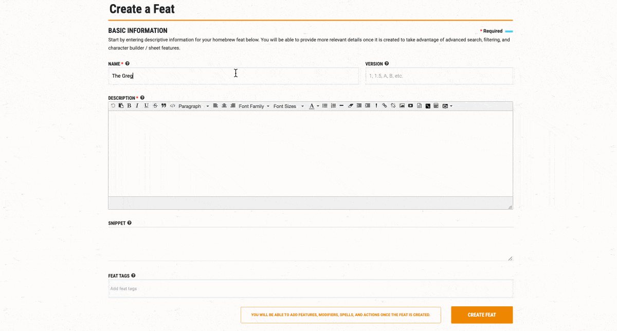 - Use the D&D Beyond Homebrew Feat tool to create your feat.