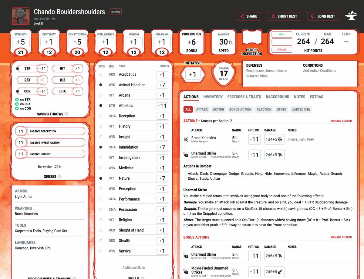 Run Towards the Danger. The combination of Chando’s Pugilist features Bloodied but Unbowed and Dig Deep, and Orcish species trait Relentless Endurance adds up to a frontline fighter that takes hit after hit without going down. Every attack Chando takes to the chin is one his allies don’t have to.